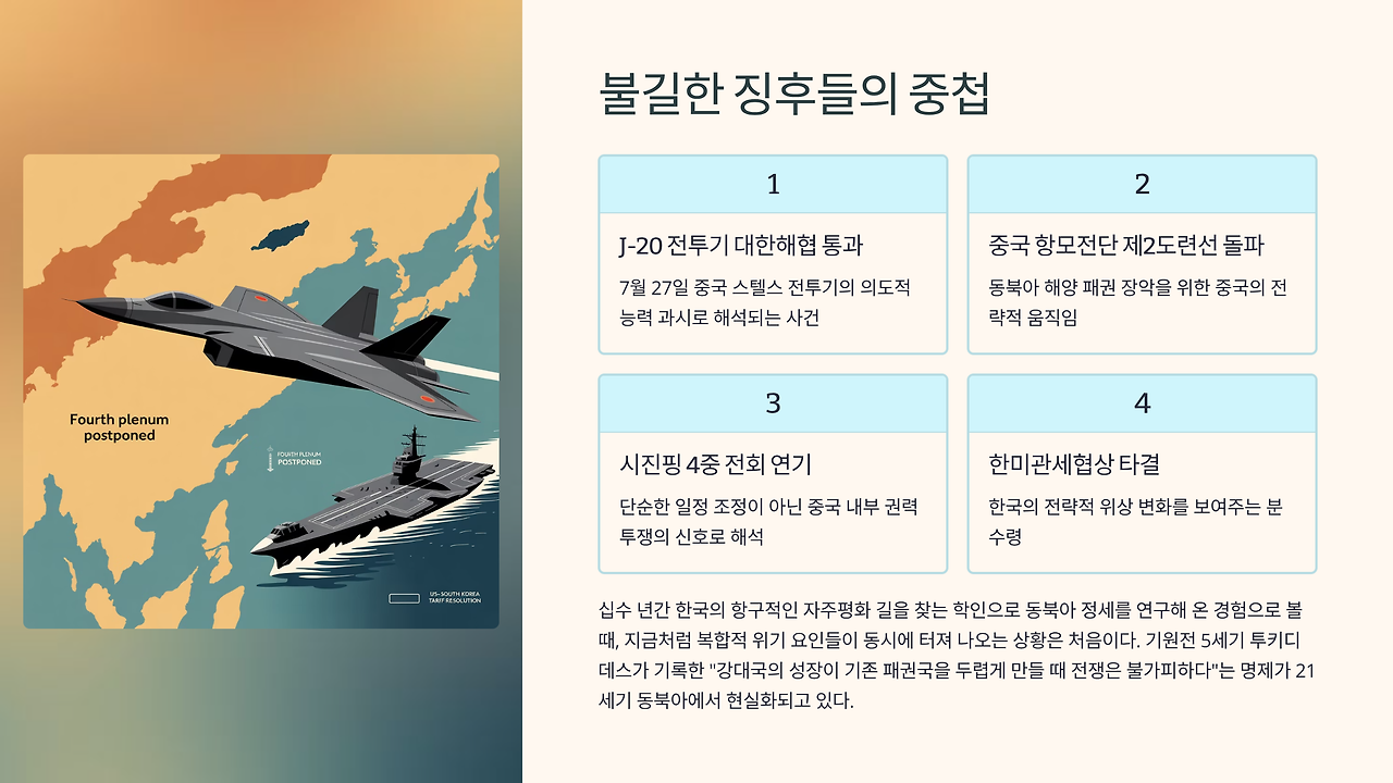 7월 27일 중국 J-20 전투기의 대한해협 통과로 추정되는 사건, 중국 항모전단의 제2도련선 돌파, 그리고 시진핑 4중 전회의 갑작스러운 연기까지. 개별적으로는 그럴듯한 설명이 가능한 사건들이지만, 퍼즐 조각을 맞춰보니 등골이 서늘해지는 그림이 드러났다.