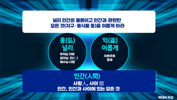 '넓다'라는 뜻을 가진 홍(弘)은 인(仁)이며 자비이고 사랑이다. 동서양 모든 사상의 핵심인 공자의 인(仁), 불교의 자비, 기독교의 사랑이 모두 이 홍(弘)에 담겨 있다. '더하다'라는 뜻을 가진 익(益)은 현대 자본주의의 핵심인 이익을 의미하는 경제 원리다. 그리고 사람 인(人) 다음에 사이 간(間)은 사람과 관계있는 모든 것, 즉 자연, 동물, 환경, 우주 만물을 포괄하는 총체적 개념이다.