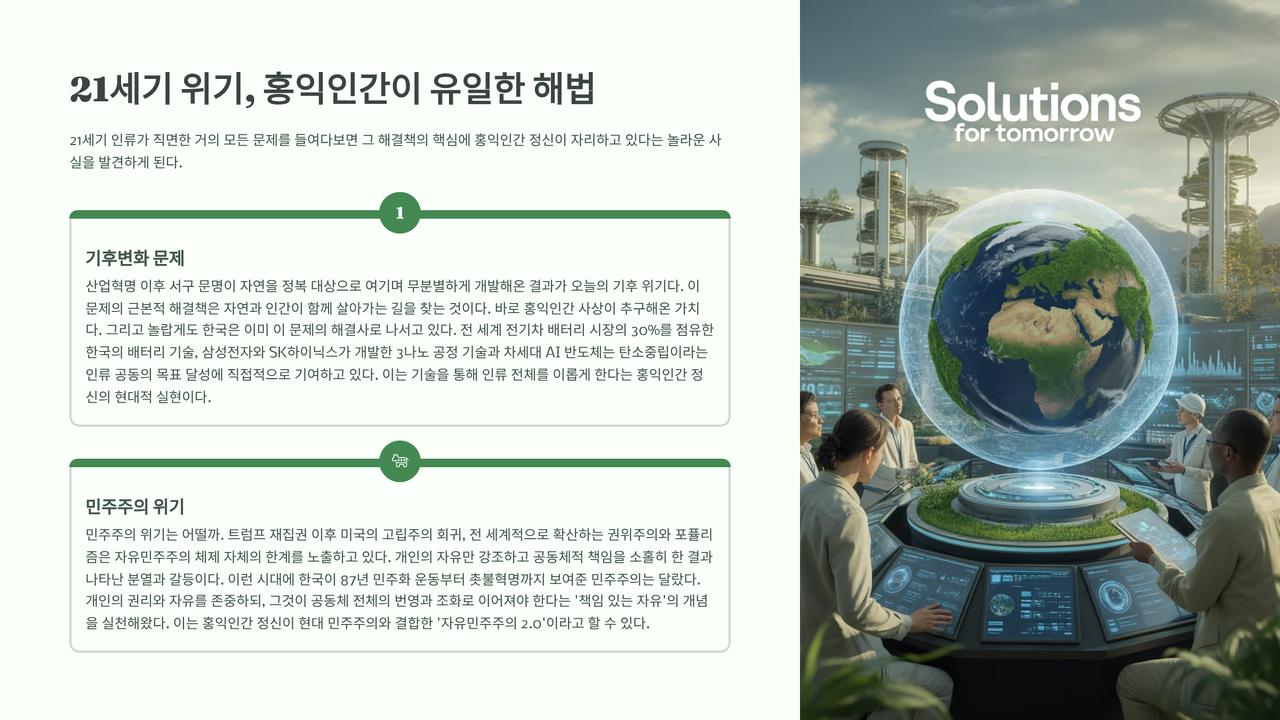 인류 문명이 갈림길에 선 이 절체절명의 순간에, 한국에게는 홍익인간 정신으로 새로운 문명 패러다임을 제시할 역사적 소명이 있다. 한반도라는 지리적 한계를 뛰어넘어 기후 위기의 해결사로서, 권위주의에 맞선 자유민주주의의 혁신자로서, 분열된 세계를 하나로 묶는 상생의 중재자로서, 그리고 자연과 인간이 조화롭게 공존하는 홍익인간 문명의 전도사로서 인류의 지속가능한 미래를 만들어가는 것이다.