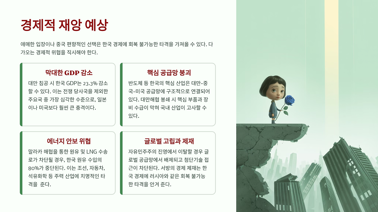 한국이 애매한 입장을 취하거나 중국 편에 선다면 경제적으로 치명적 타격을 입을 것이다. 블룸버그 등 글로벌 기관 분석에 따르면, 중국의 대만 침공 시 한국의 GDP는 23.3% 감소할 수 있다. 이는 전쟁 직접 당사국인 대만(40%), 중국(16.7%)을 제외하면 가장 심각한 수준이다. 일본(13.5%)이나 미국(6.7%) 보다 훨씬 더 큰 충격이다.