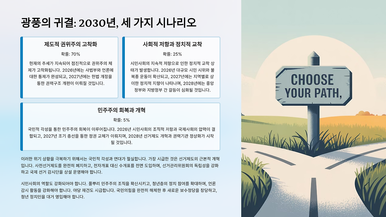 가장 희박하지만 여전히 가능한 시나리오는 국민적 각성을 통한 민주주의 회복이다. 2026년 시민사회의 조직적 저항과 국제사회의 압력이 결합되고, 2027년 조기 총선을 통한 정권 교체가 이뤄지며, 2028년 선거제도 개혁과 권력기관 정상화가 시작될 것이다. 이를 위해서는 사전선거제도 폐지, 전자개표 중단, 수개표 전면 도입 등 근본적 선거제도 개혁이 선행되어야 한다.