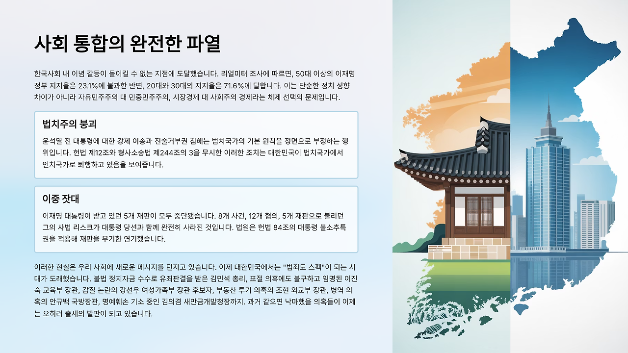 한국사회 내 이념 갈등이 돌이킬 수 없는 지점에 도달했다. 리얼미터 조사에 따르면, 50대 이상의 이재명 정부 지지율은 23.1%에 불과한 반면, 20대와 30대의 지지율은 71.6%에 달한다. 이는 단순한 정치 성향 차이가 아니라 자유민주주의 대 민중민주주의, 시장경제 대 사회주의 경제라는 체제 선택의 문제다.