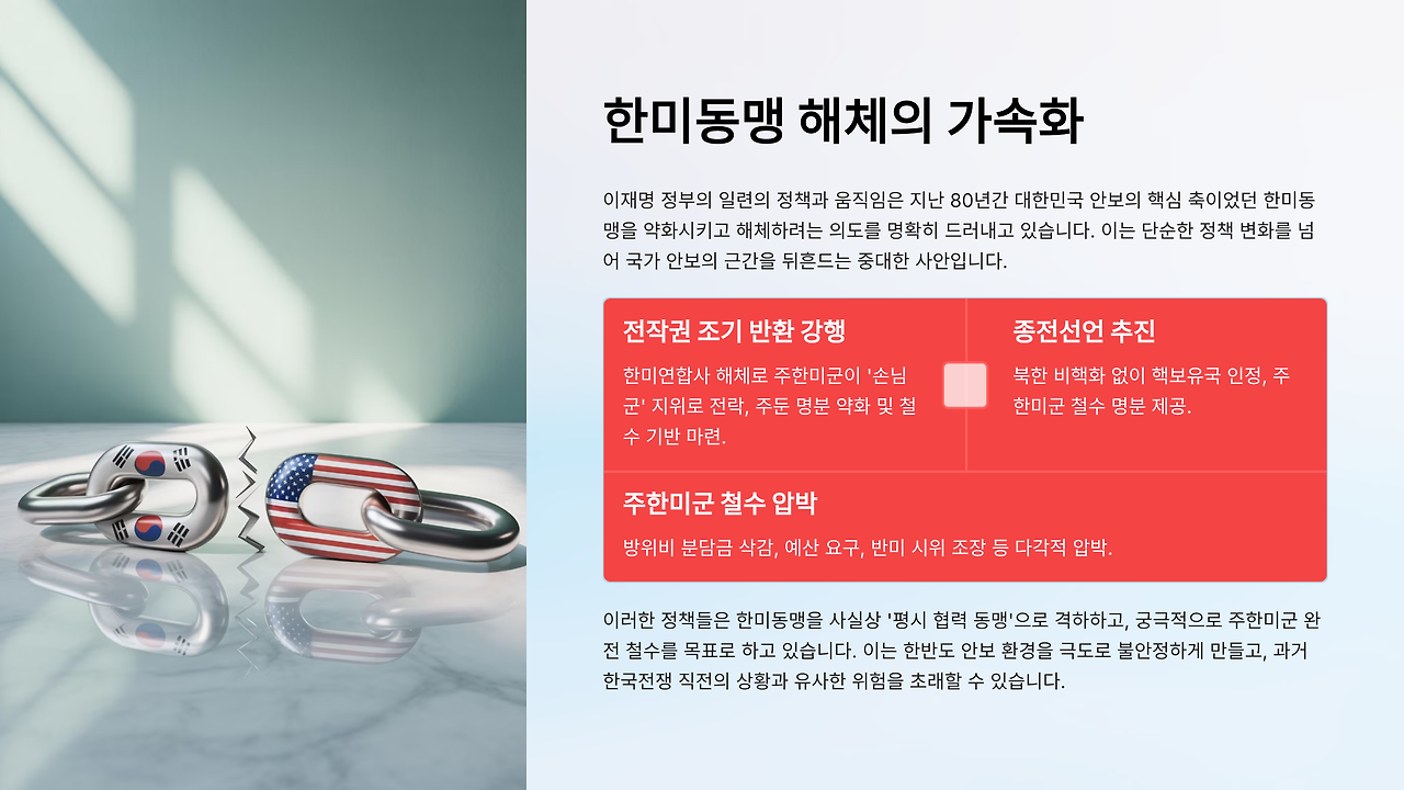 한반도 안보환경이 1950년 한국전쟁 이후 가장 위험한 국면으로 치달리고 있다. 이재명 정부의 안보정책은 한미동맹 해체와 중국 예속화를 향한 치밀한 로드맵을 따라 진행되고 있으며, 이는 구체적인 정책과 발언들을 통해 확인되고 있다.