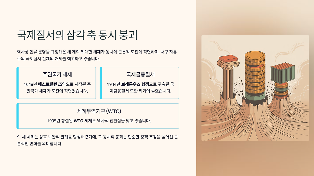 역사상 인류 문명을 규정해 온 세 개의 위대한 체제가 동시에 근본적 도전에 직면했다. 1648년 베스트팔렌 조약으로 시작된 주권국가 체제, 1944년 브레튼우즈 협정으로 구축된 국제금융질서, 그리고 1995년 창설된 세계무역기구(WTO) 체제가 모두 역사적 전환점을 맞고 있다.