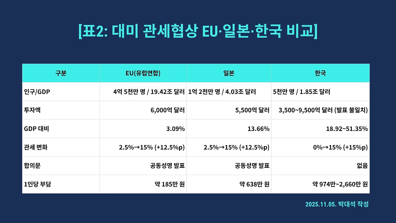그런데 한국은? 백악관 팩트시트 한국 관련 문서에는 'Tariff(관세)'라는 단어 자체가 없다. 'Agreement(합의)'라는 표현도 없다. 투자 금액만 나와 있다. 이것이 협상인가, 상납인가. 한국만 한미 FTA 0% 특혜를 잃고 15% 포인트 전액 인상을 당했다. GDP 대비 부담은 일본의 1.4배, EU의 6배다. 1인당 부담은 EU의 5배, 일본의 1.5배다. 그런데도 공동성명 하나 없다.