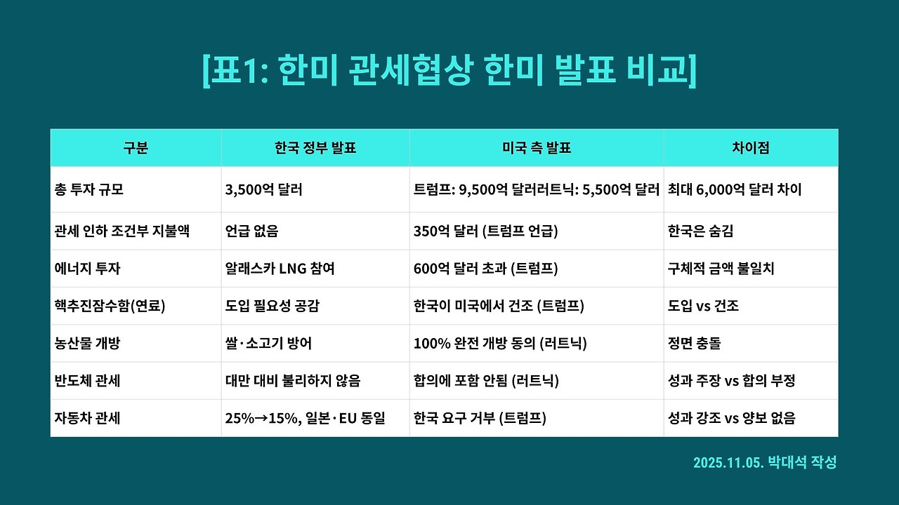 2025년 지금, 그 좋았던 한미 FTA는 사라졌다. 0% 무관세는 15%로 올랐고, 일부는 25~50%까지 치솟았다. 3,500억~9,500억 달러를 조공처럼 갖다 바쳤는데도, 7월 실무 협상, 8월과 10월 두 차례 정상회담을 했는데도, 공동성명 하나 없다. 일본, EU보다 훨씬 불리한 조건인데도, 정부와 언론은 "잘했다"라고 자화자찬한다.