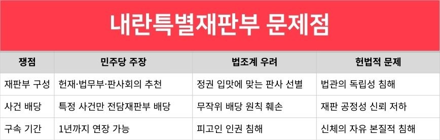 그러나 현행 헌법은 제110조에서 군사재판을 관할하는 군사법원 외에는 특별법원을 원칙적으로 금지하고 있다. 민주당이 추진하는 내란전담재판부는 헌법상 근거가 없는 위헌적 제도다.