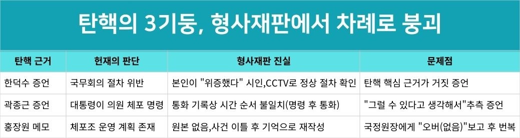 헌법재판소가 2025년 4월 4일 윤석열 대통령을 탄핵할 때 의존했던 세 가지 핵심 근거가 지금 형사재판에서 하나씩 무너지고 있다. 한덕수 전 총리의 '국무회의 절차 위반' 증언, 곽종근 전 특전사령관의 '대통령 명령' 증언, 홍장원 전 국정원 차장의 '체포조 메모'가 그것이다.