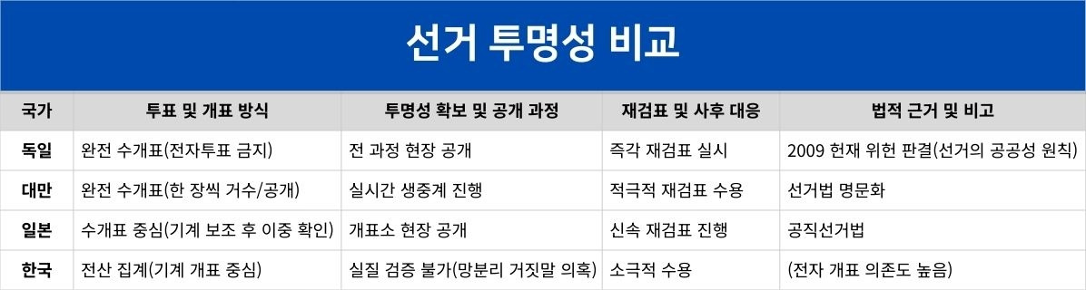 우리가 요구하는 것은 특정 정당의 승리가 아니다. 독일처럼 "일반 시민이 전문 지식 없이도 검증 가능한 선거" 시스템을 도입하자는 것이다. 구체적 대안은 명확하다: