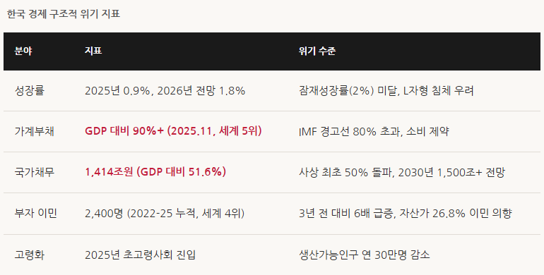 원/달러 환율은 취임 시 1,380원에서 2026년 1월 현재 1,475원으로 6.9% 급등했다. 한국은행 이창용 총재는 "전통적인 금융위기는 아니지만 위기라 할 수 있고 걱정이 심하다"라고 밝혔다. 임시 금융통화위원회가 5차례나 소집된 것은 사상 이례적이다. 그러나 환율 급등은 빙산의 일각에 불과하다. 한국 경제가 직면한 것은 단기적 변동이 아니라 구조적 붕괴의 징후다.