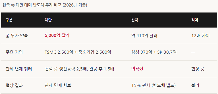 한국 정부가 "대만보다 불리하지 않은 대우"를 약속받았다고 자평하는 동안, 대만은 5,000억 달러로 확실한 면제를 확보했고 한국은 100% 관세의 칼날 위에 서 있다. 이것이 현재 한국 경제가 직면한 현실이다.