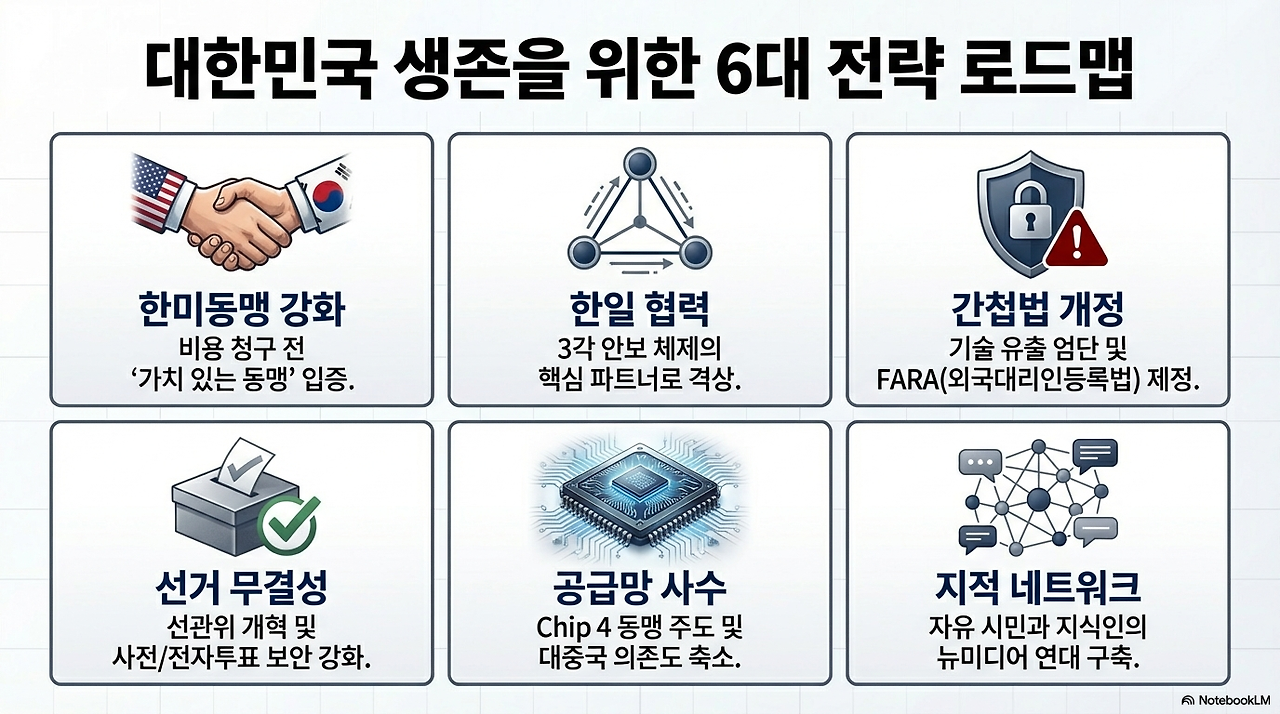 다섯째, 반도체 공급망에서의 전략적 위상을 사수해야 한다. Chip 4 동맹에서 배제되지 않도록 미국·일본·대만과의 기술 협력을 강화하고, 중국 의존도를 낮춰야 한다.