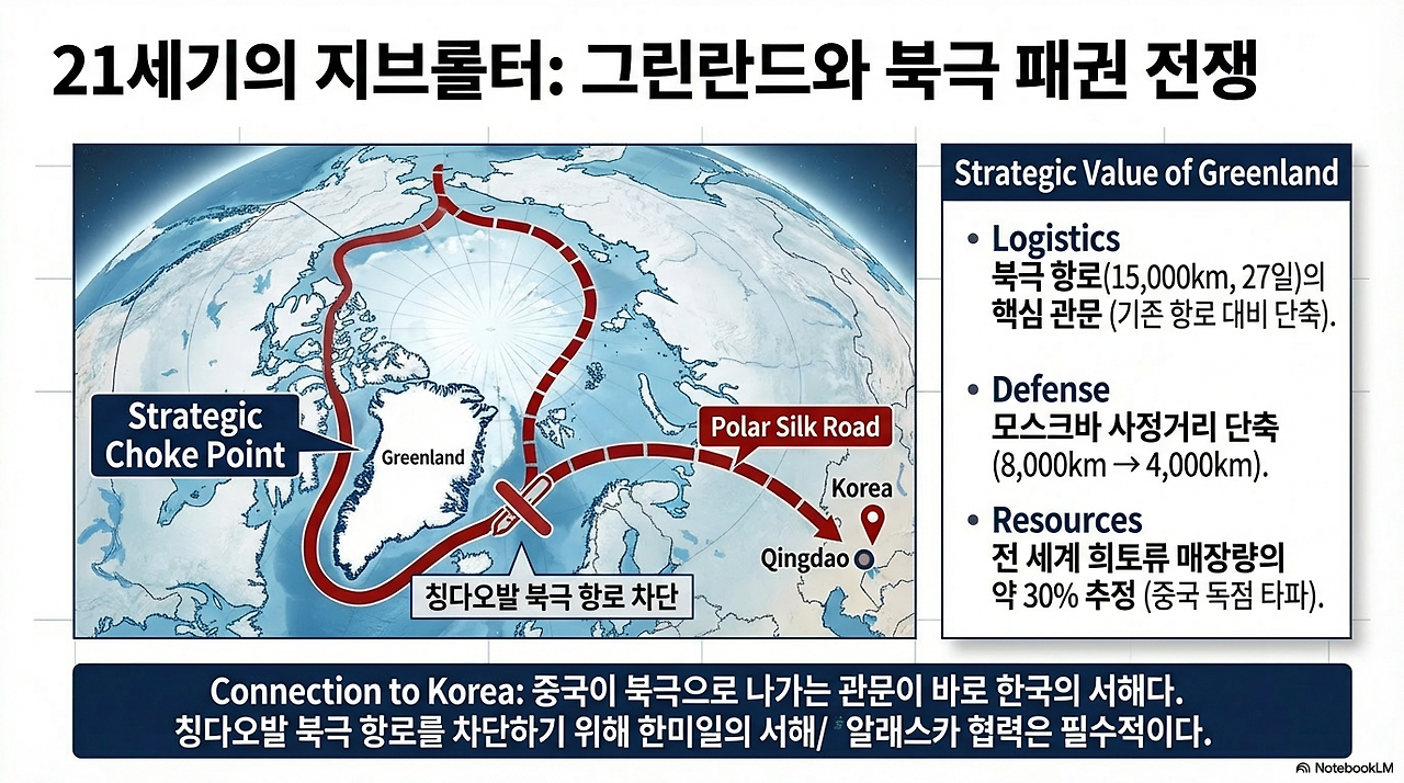 그린란드는 북극 항로의 관문이자, 중국의 서해 진출 및 북극해 확장을 차단하는 전략적 요충지다. 그린란드를 장악하는 국가가 대서양과 북극해의 물류 패권을 쥐게 된다. 이곳은 21세기의 지브롤터다. 중국과 러시아는 북극 항로 개발에 막대한 자금을 투자해 왔다. 그린란드가 미국 영토가 되면 이 모든 계획은 물거품이 된다.