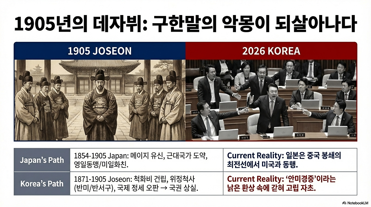1905년 을사늑약 당시, 일본은 이미 1854년 미일화친조약 이후 50년간 메이지유신을 통해 적극적으로 개항하고 서양 문물을 받아들여 근대국가로 도약했다. 반면 조선은 대원군의 쇄국정책으로 1871년 척화비를 세우며 "서양 오랑캐와 화친하는 것은 나라를 파는 것"이라 외쳤다.