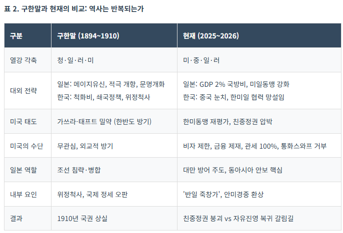 일본이 문명개화를 외칠 때, 조선은 위정척사를 외쳤다. 그 결과가 1910년 국권 상실이었다. 역사는 지금 반복되고 있다. 일본은 미일동맹을 강화하며 중국 봉쇄에 적극 나서고, 한국은 중국 눈치를 보며 한미일 협력을 망설인다.