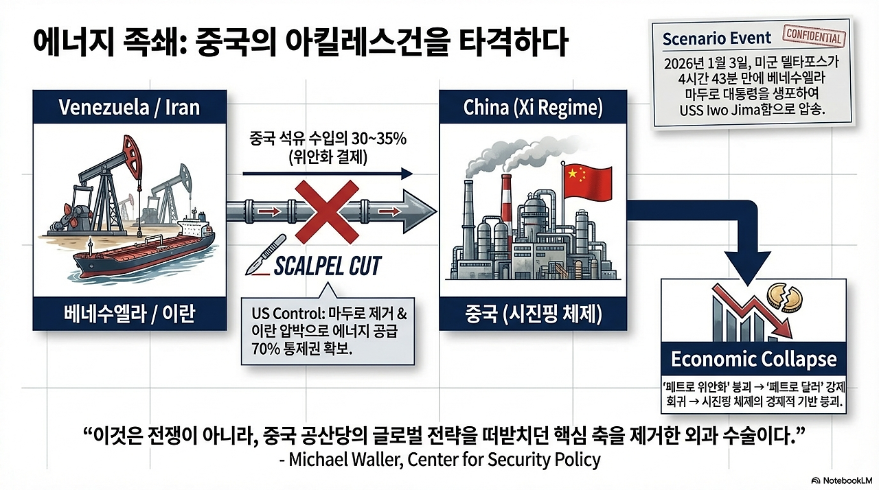 이는 대만 침공 계획을 좌절시키고, 일대일로를 무력화하며, 시진핑의 AI·반도체 패권 야심을 꺾는 결정타다. 마이클 월러는 이렇게 결론 내렸다. "이란과 베네수엘라 정권 교체는 중국 공산당 통치의 종말, 나아가 중국 공산당 자체의 종말을 의미할 수도 있다."