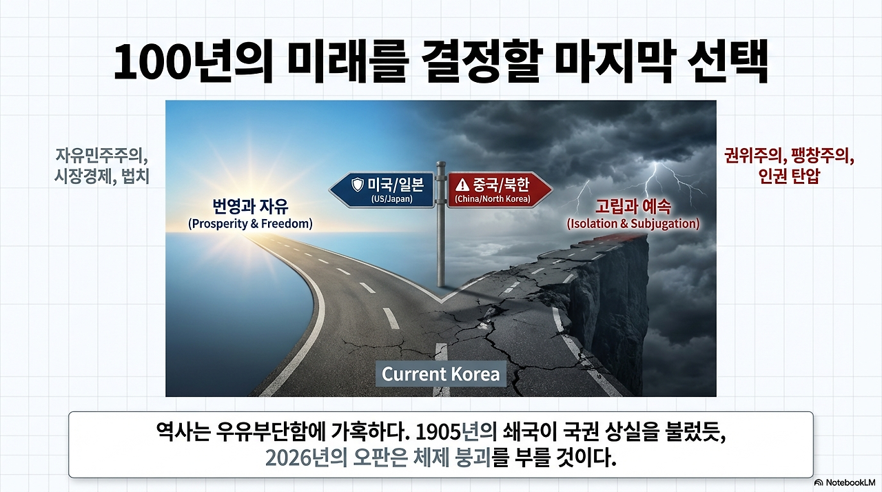 역사는 우유부단함에 가혹하고, 원칙 없는 타협에 냉소적이다. 구한말 쇄국이 국권 상실을 불렀듯, 지금의 안미경중 환상은 자유민주주의 체제 붕괴를 부를 것이다. 지금 이 순간의 선택이 대한민국의 미래 100년을 결정한다. 문명의 선택은 이미 시작됐다. 자유를 선택할 것인가, 억압을 선택할 것인가. 역사는 결단하는 자의 편이다.