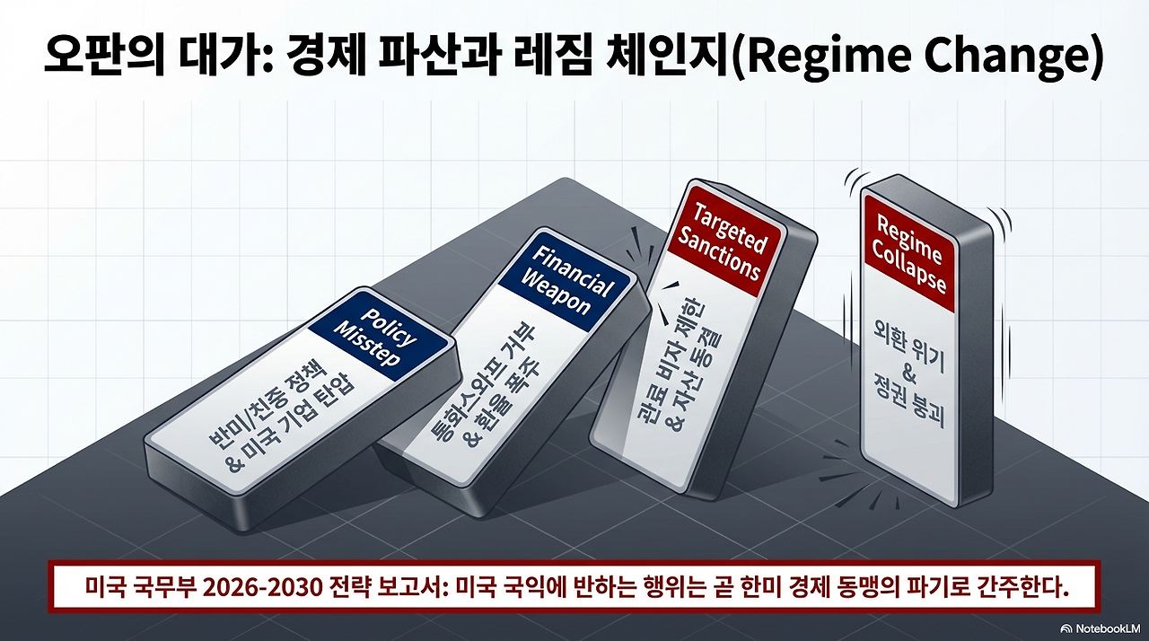 미국 국무부 2026~2030 전략 보고서는 이재명 정권을 겨냥한다. 미국 기업과 국민에 대한 경제 침해나 표현의 자유 침해가 발생할 경우, 비자 제한 및 금융 제재를 포함한 모든 수단을 동원하겠다고 명시했다. 온플법을 추진하는 정부 인사들, 쿠팡을 괴롭히는 민노총 간부들, 정통망법을 설계한 김용석·주병기 등 이재명 정권에서 해당되는 고위 공직자들이 비자 제한과 금융 제재 대상이 될 수 있다.