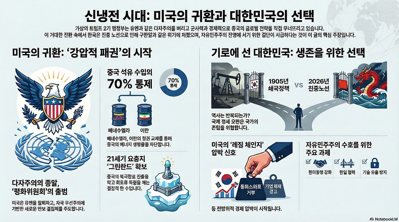 트럼프 2기 미국은 이 비정상을 끝내고 있다. 유엔 중심의 다자주의를 폐기하고, 군사력과 경제력으로 중국의 목줄을 조이며, 반문명 세력을 하나씩 제거하는 강압적 패권 전략으로 전환했다.