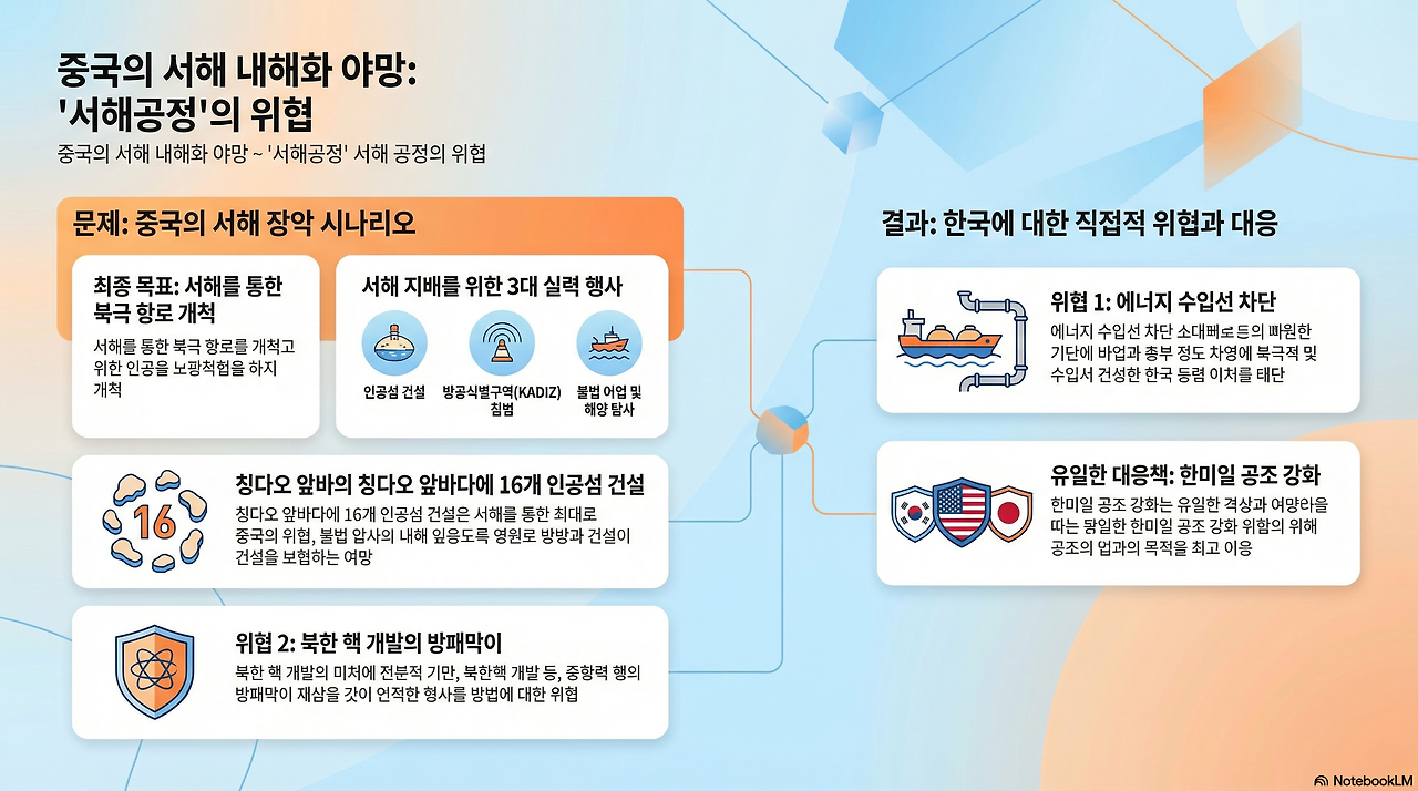 이것이 바로 중국이 서해를 '내해(內海)'로 만들려는 '서해공정'의 본질이다. 중국은 칭다오 앞바다에 인공섬 16개를 건설했고, 서해 이어도 주변 방공식별구역(KADIZ) 침범, 불법 어업, 해양 탐사를 통해 서해 지배권을 기정사실화하려 한다.
