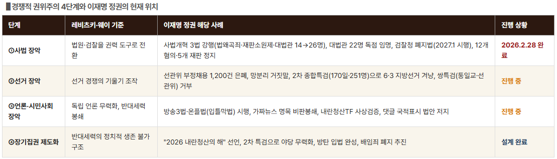 이재명 정권 9개월은 실정의 나열이 아니다. 레비츠키·웨이의 경쟁적 권위주의 경로를 충실히 따라 사법 장악을 완료했고, 선거·언론 통제를 진행 중이며, 영구집권 구조 설계를 마쳤다. 취임 9개월에 사법 장악을 완료한 속도는 차베스도 따라오지 못했다.