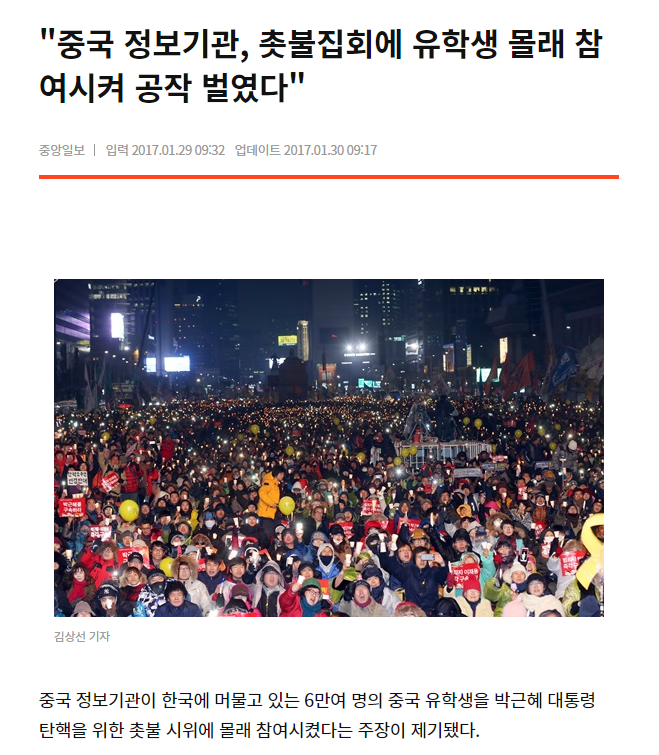 중국 정보기관이 박 대통령을 밀어내는 공작을 벌였다는 것은 정보 세계에서는 진실이다. / 중앙일보 기사 중