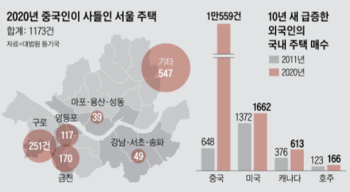 지난 10년간 중국인의 국내 주택 매입은 16배가량 증가했다. 2021년 7월 28일 대법원 등기국에 따르면, 중국인이 사들인 국내 집합건물(아파트·빌라·오피스텔 등)은 2011년 648건에서 지난해 1만559건으로 폭등했다. 같은 기간 외국인의 전체 매수 등기 건수는 3238건에서 1만9371건이 돼 6배로 늘었다.