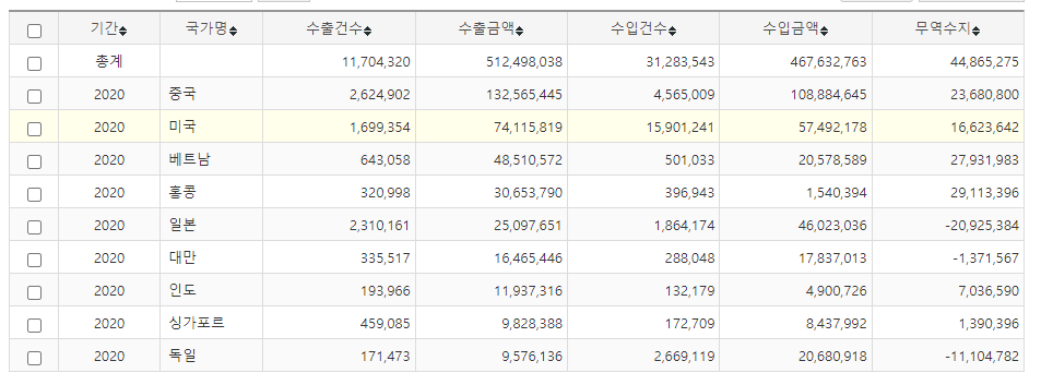 2020년 기준 국가별 수출입통계 / 관세청