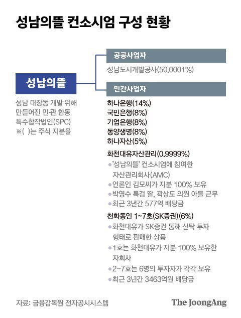 참고로 성남 도시개발공사가 보유한 지분은 모두 우선주이다. 배당 우선권만 있는 우선주를 반 이상을 가져도 의결권이 없음으로 성남의뜰 사업을 좌지우지할 수 없다. 의결권이 있는 지분권자인 화천대유 자산관리와 천화동인 1호에서 7호까지 회사가 특정금전 신탁한 SK증권이 사실상 시행사 경영 집행권이 있기 때문이다.