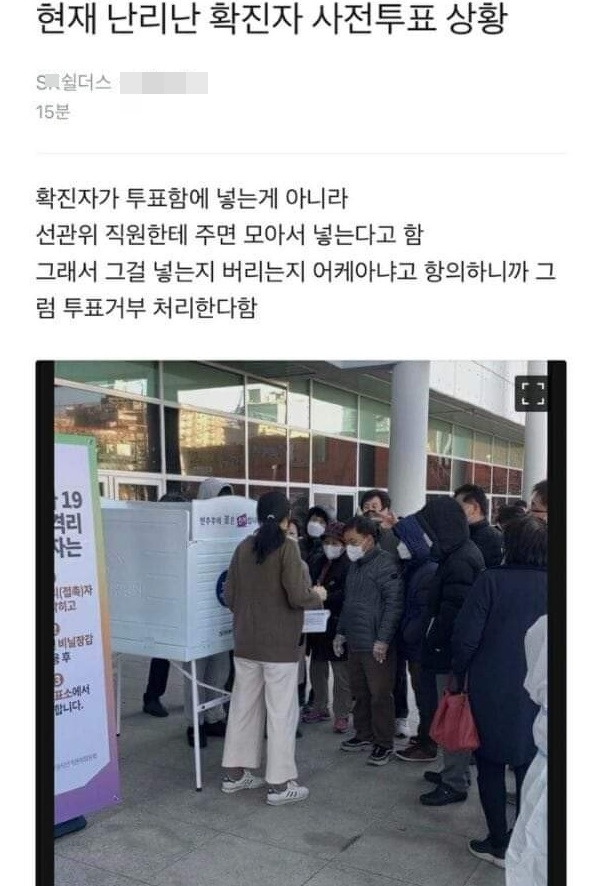 그런데 이들에 대한 선거 관리가 엉망이다. 투표한 국민이 직접 정해진 투표함에 투입해야 할 기본적인 권리도 지켜지지 않았다. 확진자가 투표한 투표지를 쓰레기 통 옆에서 종이 박스, 비닐봉지 등에 넣어 누가 어디에 어떻게 이동, 보관하는지 알 수 없다. 심지어는 신원확인 하지 않았다니...