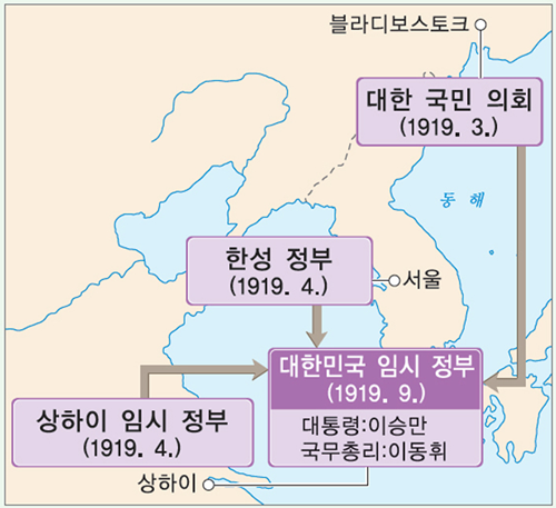 한국은 3개의 임시정부가 있었고, 1919년 9월 11일 하나로 통합되었다. / 이미지 금성출판사, 티칭 백과