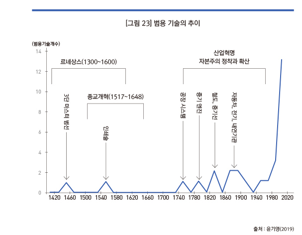 시대별로 혁신적인 범용 기술을 보면 르네상스 시대에는 돛을 3개 가진 항해선이 있었고, 종교개혁 때는 인쇄술이 있었다. 그 이후에는 별다른 기술 혁신이 없다가 1차 산업혁명 때 공장 시스템과 증기기관이 있었다. 2차 산업혁명 때는 철도, 증기선, 내연기관, 전기 등이 출현했다. 3차 산업혁명 때는 컴퓨터, 인터넷이 등장했다.
