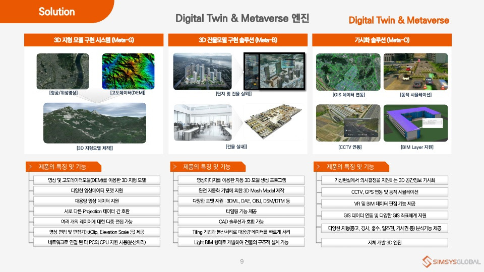 ㈜심시스글로벌은 국방, 정보, 공공, 민간분야에서 최고의 공간정보솔루션 제공 중, 사물인터넷, AI, 빅데이터, 블록체인 기술 등 4차 산업혁명 첨단기술 역량을 보유한 회사 자료
