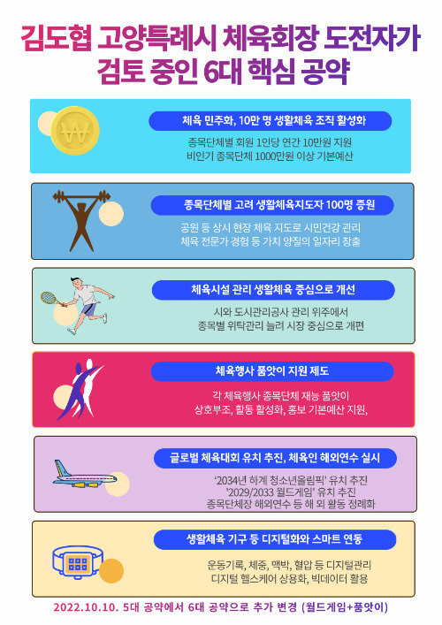 김도협 회장은 12월 22일 고양시 체육회장에 도전 의사를 밝히면서 지난달 27일 검토 중인 5대 핵심공약에 '고양시 체육행사 품앗이 지원'제도를 추가한다고 말했다.