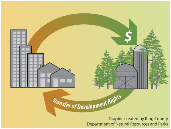 '개발권 양도제(TDR)' 구조 요약 / 이미지 출처 kingcounty 홈페이지장관님도 아 시다시피 '개발권 양도제'는 개발권과 소유권을 분리시킨 개념으로서 관련 법·제도에 의해 개발이 제한되는 지역의 개발권을 고밀도 개발이 가능한 지역으로 매매 또는 양도할 수 있도록 하는 제도를 말합니다.