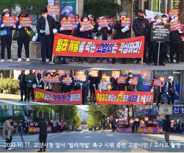 이 글을 쓰는 시간에도 고양시청 앞에는 빌라(연립) 재개발을 촉구하는 신도시 지역 외 주민들의 시위가 벌어지고 있습니다.