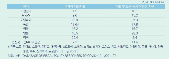 한국, 주요 나라 GDP 대비 재량적 재정정책 / 출처 국회 입법조사처 NARS현안분석 214호 코로나 팬데믹으로 인한 서민과 소상공인의 경제 충격을 완화하기 위해 각국은 각종 코로나 재난지원금 명목으로 막대한 돈을 살포했다. 한국 역시 2020년 및 2021년에 ‘코로나19 대응 재난지원 프로그램’으로 총 여섯 차례나 추가경정예산을 집행했다. 2021년 정부 총지출은 604.9조 원에 달하며, 이는 2020년의 554.7 조원 대비 9.0%인 50.2조 원이 급증한 규모이다.