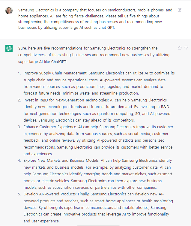 챗GPT가 추천한 기존사업 경쟁력강화 방안과 추천 신사업 등 5가지 / 필자가 실제 문답한 OPEN AI 채팅 화면 캡처"물론 삼성전자가 ChatGPT와 같은 초대형 AI를 활용해 기존 사업의 경쟁력을 강화하고 신규 사업을 추천하기 위해 5가지를 추천합니다.