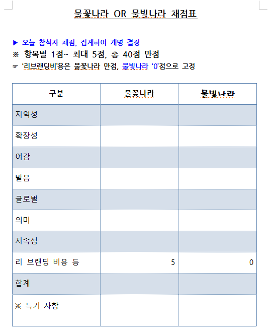 리브랜딩 평가표 양식 / 물빛나라추진단 제공
