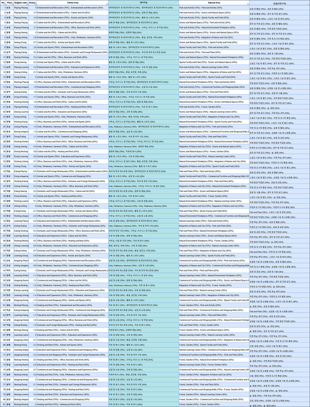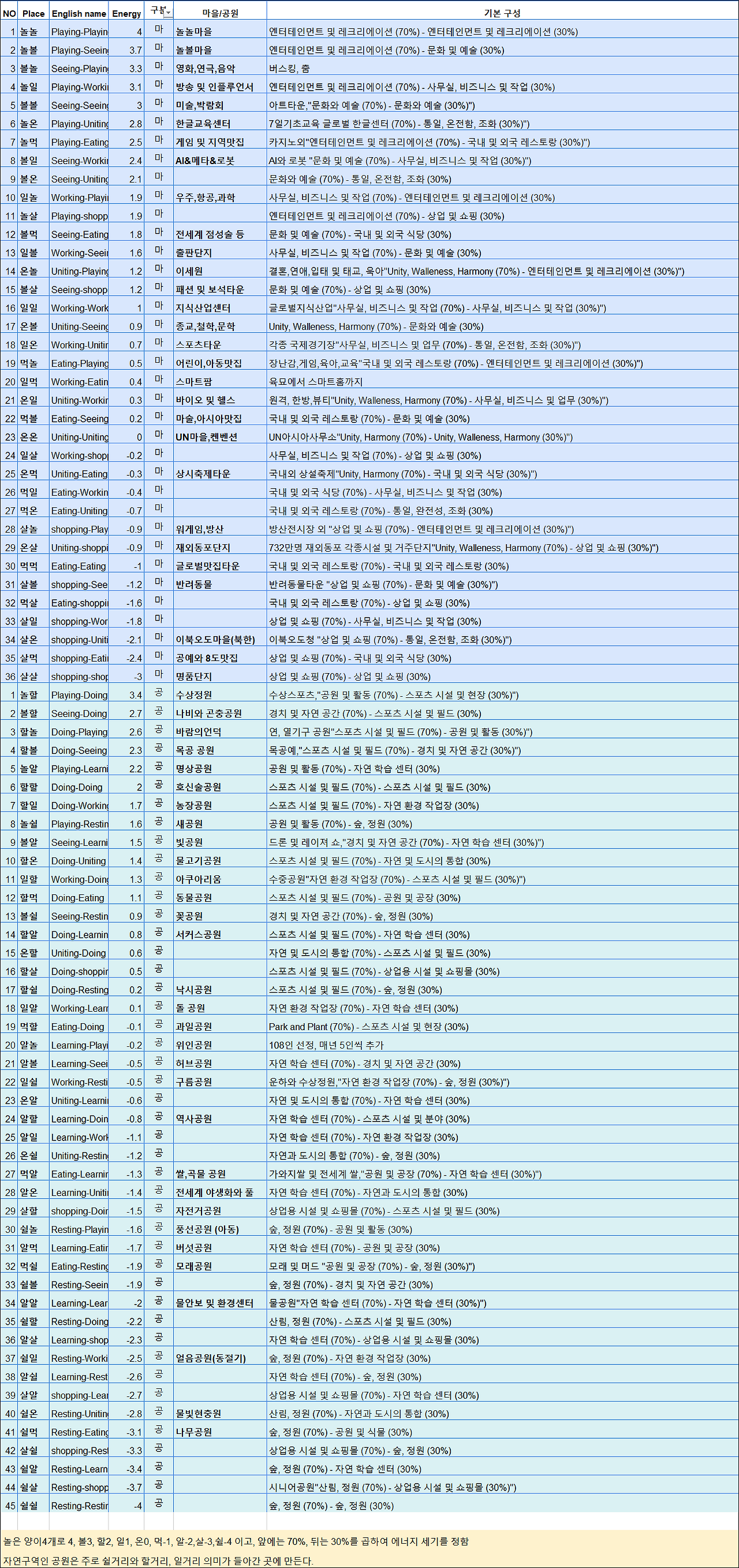 놀거리는 양양양양, 볼거리는 양양양, 할거리는 양양, 일거리는 양, 온거리는 중앙, 먹거리는 음, 알 거리는 음음, 살거리는 음음음, 쉴거리는 음음음음,으로 음양의 세기를 구분한다. 양하나는 1, 음하나는 -1 중앙은 0으로 계산한다. 따라서 놀거리는 4가 되고 쉴거리는 음수인 -4가 된다. 음양오행과 주역의 64괘를 참고하였다.