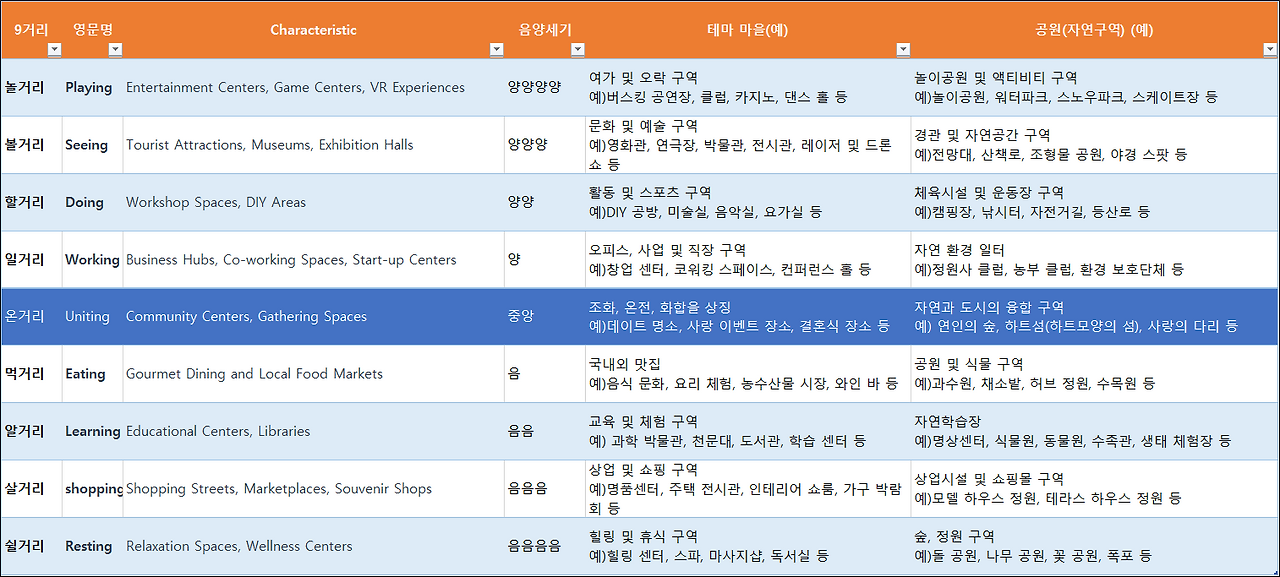 '볼살마을'은 볼거리가 70% 비중으로 많으며 살거리도 30% 비중이 되는 마을이다. '쉴알공원'은 명상 등 쉬는 시설이 70%이고 배울거리 비중이 30% 되는 자연구역이다. '9 거리'만 알면 마을이름과 공원이름만 보아도 무슨 마을인지 무슨 공원인지 이해가 되고 찾기 쉽다. 또 순수 우리말로 두 글자로 만들어 젊은이들이 선호하며 글로벌 적합성도 있다.