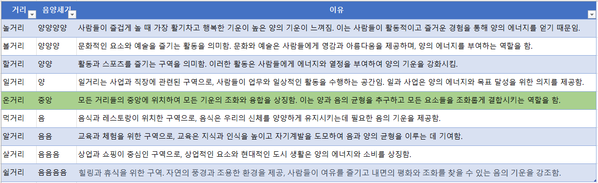 신광철 작가는 관광 및 상존하는 주민 등 사용자 입장에서 8 거리를 기본 모형으로 채택했다. 여기에 필자는 8 거리 중앙에 해당하는 화합, 단결, 조화, 중앙의 의미를 갖는 온거리 (뭉거리 의견도 있었음)를 추가했다. 9 거리가 된다. 9 거리는 온거리가 중앙에 해당하고 8 거리는 성질에 따라 8개의 음양으로 구분한다.