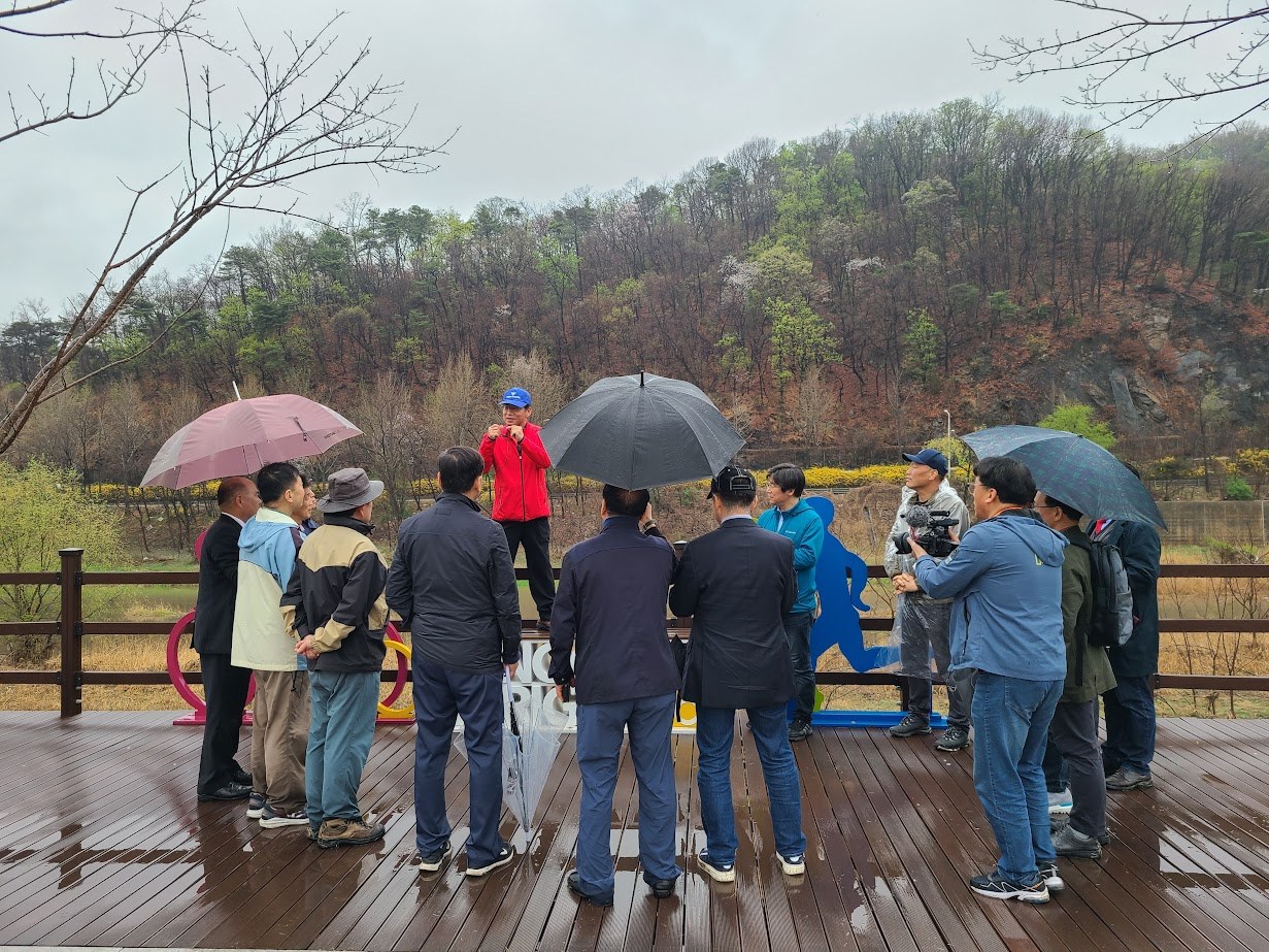 2023.04.05. 비오는 날 공릉천 변에서 물빛나라 추진단 전문가들에게 물과 환경 등에 대하여 노상강의를 하는 김영석 박사(가운데 빨간 셔츠)