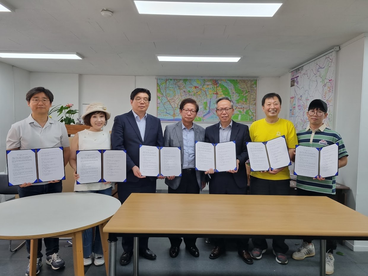 친수도시 사업인 물빛나라메타버스 구축을 위한 관련회사 등 제휴체결식에서 정 중앙에 선 김영석 토목환경공학 박사