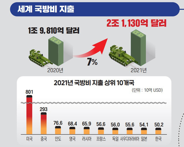 2022.12.09. kbs뉴스에서전 세계 2021년 기준 연간 국방예산은 2조 1,130억 달러이고 한국은 세계 10위 수준이다. 산업연구원이 27일 발표한 '우크라이나 전쟁 이후 글로벌 방산시장의 변화와 시사점' 보고서에 따르면 앞으로 10년 동안(2023∼2032년) 전 세계 국방 예산은 기존 전망치보다 2조 달러(약 2,600조 원), 무기획득 예산은 6,000억 달러(약 780조 원) 이상 증가할 전망이다.