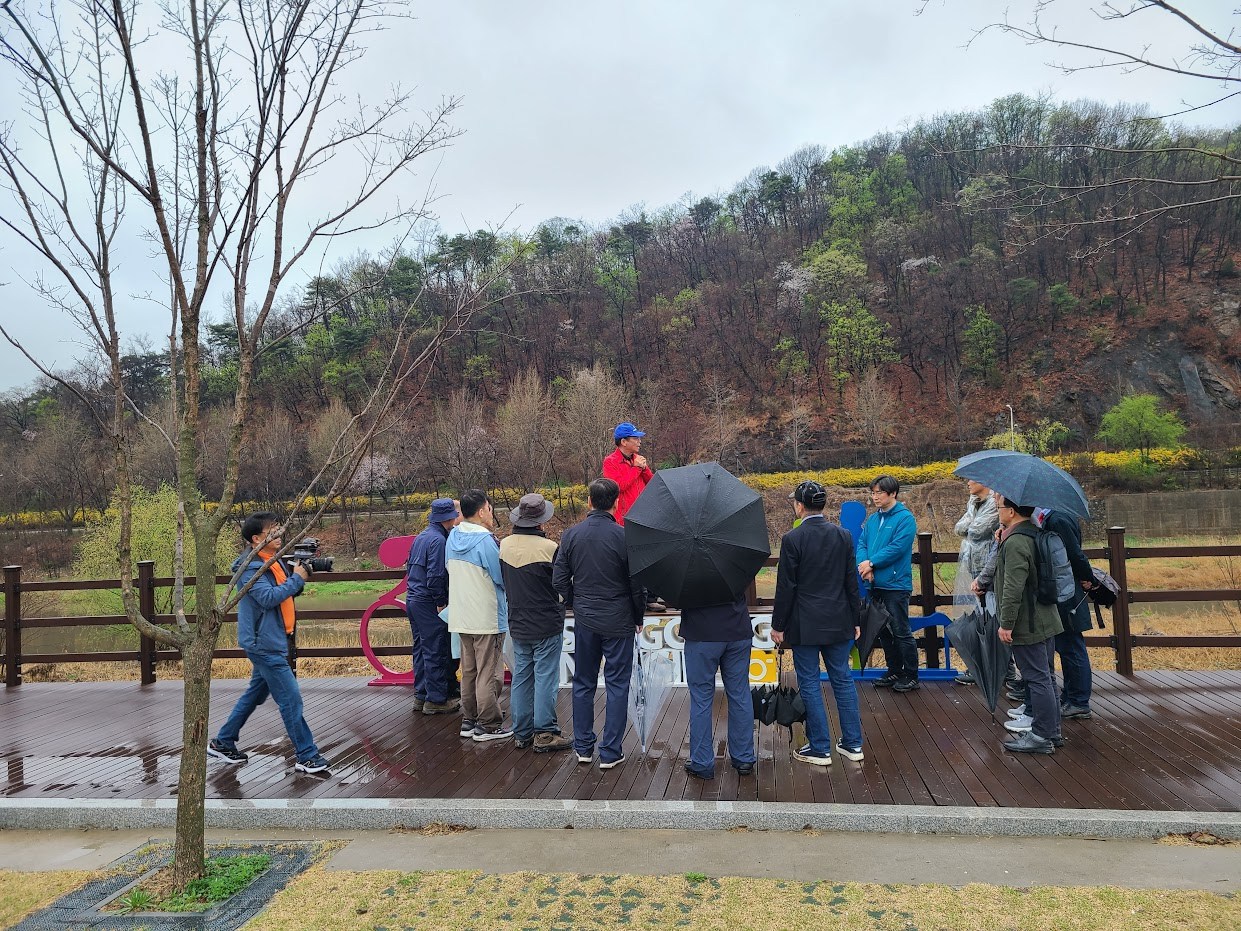 2023.04.05. 단비가 내리는 가운데 공릉천 변에서 물빛나라 추진단 각계 전문가들에게 현장을 설명하는 김영석 박사, 중앙에 빨간 옷 / 촬영 박대석박대석) 최근 친수 도시 사업 일종인 '물빛나라'에서 전문가로서 지원해주고 계시는데요?