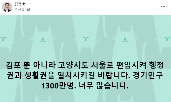 국민의힘 일산동구 김종혁 당협의원장 페이스북 캡처(2023.10.30. 밤 11시경 게시글)당연히 고양시 서울통합에 반대하는 일부 시민도 있겠지만 현지 분위기를 고려하면 대부분의 고양시민은 적극 환영할 것으로 전망된다. 벌써 국민의힘 고양시 당협위원장 등 정치인은 물론이고 일부 시민단체들이 합세하여 고양시의 서울 그랜드 메가시티 통합 추진위 구성을 계획 중인 것으로 파악된다. 나아가 고양시 추진위 중심으로 수도권 다른 도시와 연대 추진도 주도할 움직임을 보이고 있다.