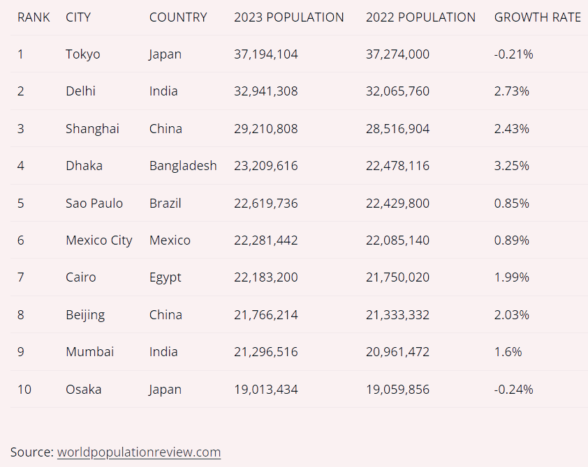 2023년 기준 세계 10대 메가시티, 가장 큰 곳은 인구가 3,700만 명이 넘는 일본의 도쿄 / neomsaudicity