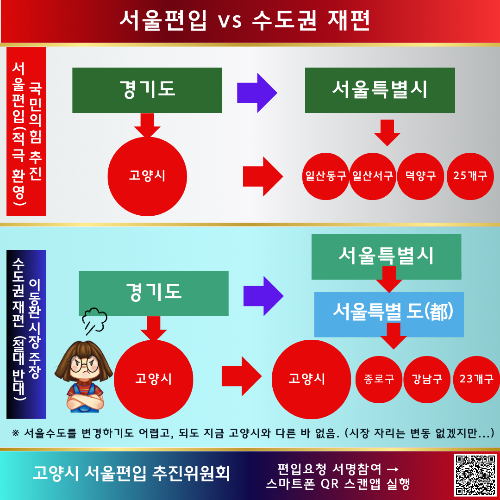 국민의힘은 당론으로 추진 중이고 고양시는 지역 국회의원 3~4명 당선되면 추진 확실, 이미 1월 23일 국민의힘 예비후보 전원은 합동기자회견을 통하여 서울편입 추진 공개적 약속함. 또 한동훈 국민의힘 비대위원장은 제22대 국회 개원하면 시민 뜻에 따라 서울편입 등 원샷법 발의 공개 약속 함.