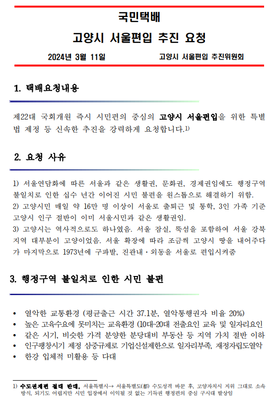 경제자유구역도 이미 고양시서울편입추진위원회가 지난 1월에 국민의힘 뉴시티특위위원장(조경태 5선 의원) 간담회 때 서울편입 특별법에 경제자유구역지정을 포함하자는 제안에 가능하다는 답변을 넘어서, 한동훈 비대위원장이 명시적으로 확정했다는 데 큰 의미가 있다.